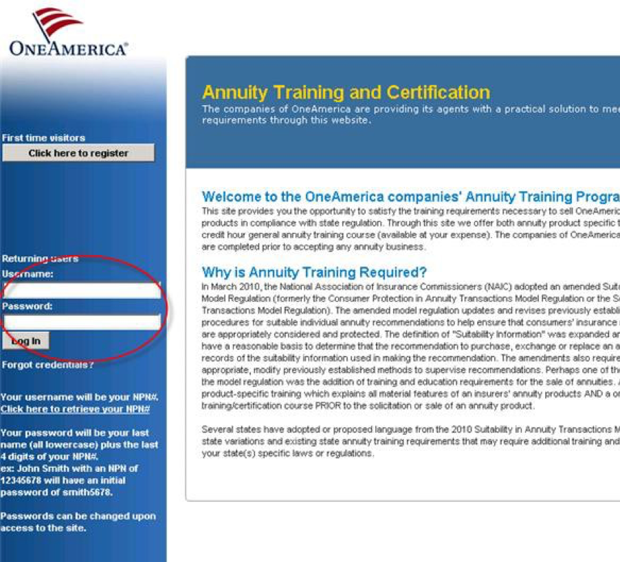 - Password is your last name (all lowercase) plus the last 4 digits of your NPN # https://naic.pinpointglobal.com/OneAmerica/Apps/default.aspx