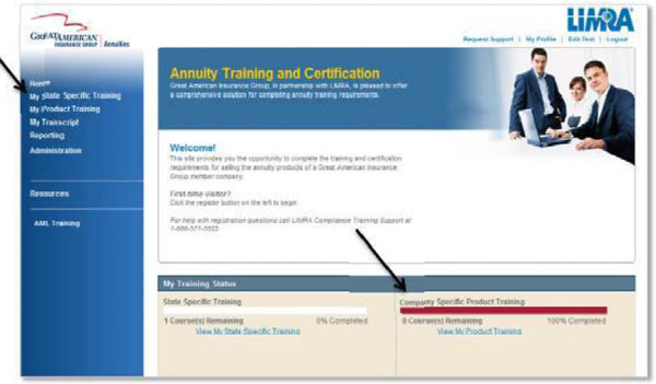 3. Once you are logged in, you will find your training status based on state-specific training on the left side of the screen, and company-specific product training on the right.